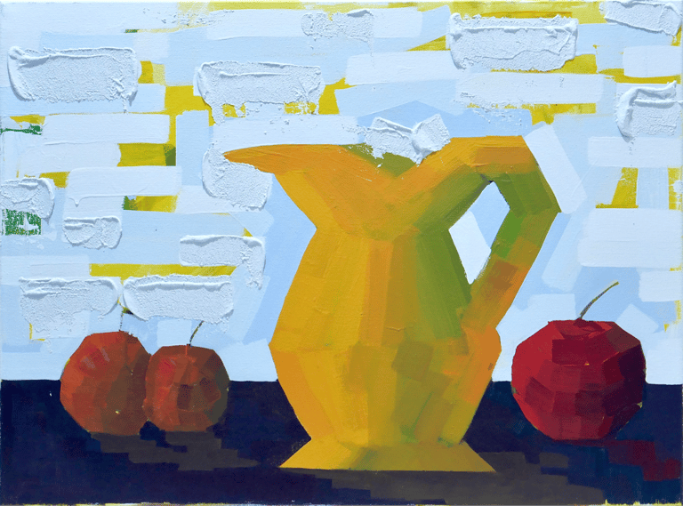 "Out of the Yellow Jug" displays the simplicity of life, food and water, being basic necessities of life. Out of this comes a calming and peaceful life, full and good. This pieces uses beach sands in North Carolina for that purpose.